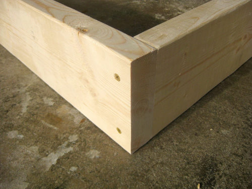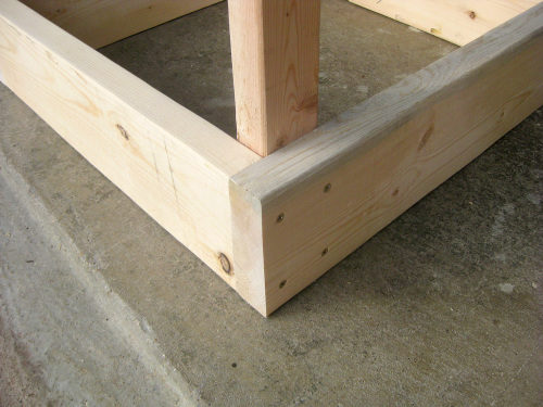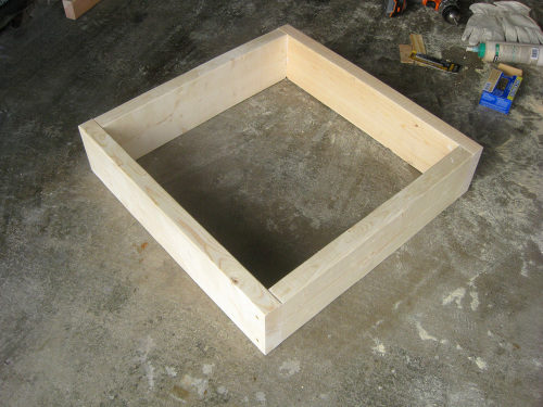 6. Place one of the 2″ x 2″ x 33″ stud pieces to the inside corner of one of the frames. This frame will be the base (or the bottom floor) of the box.